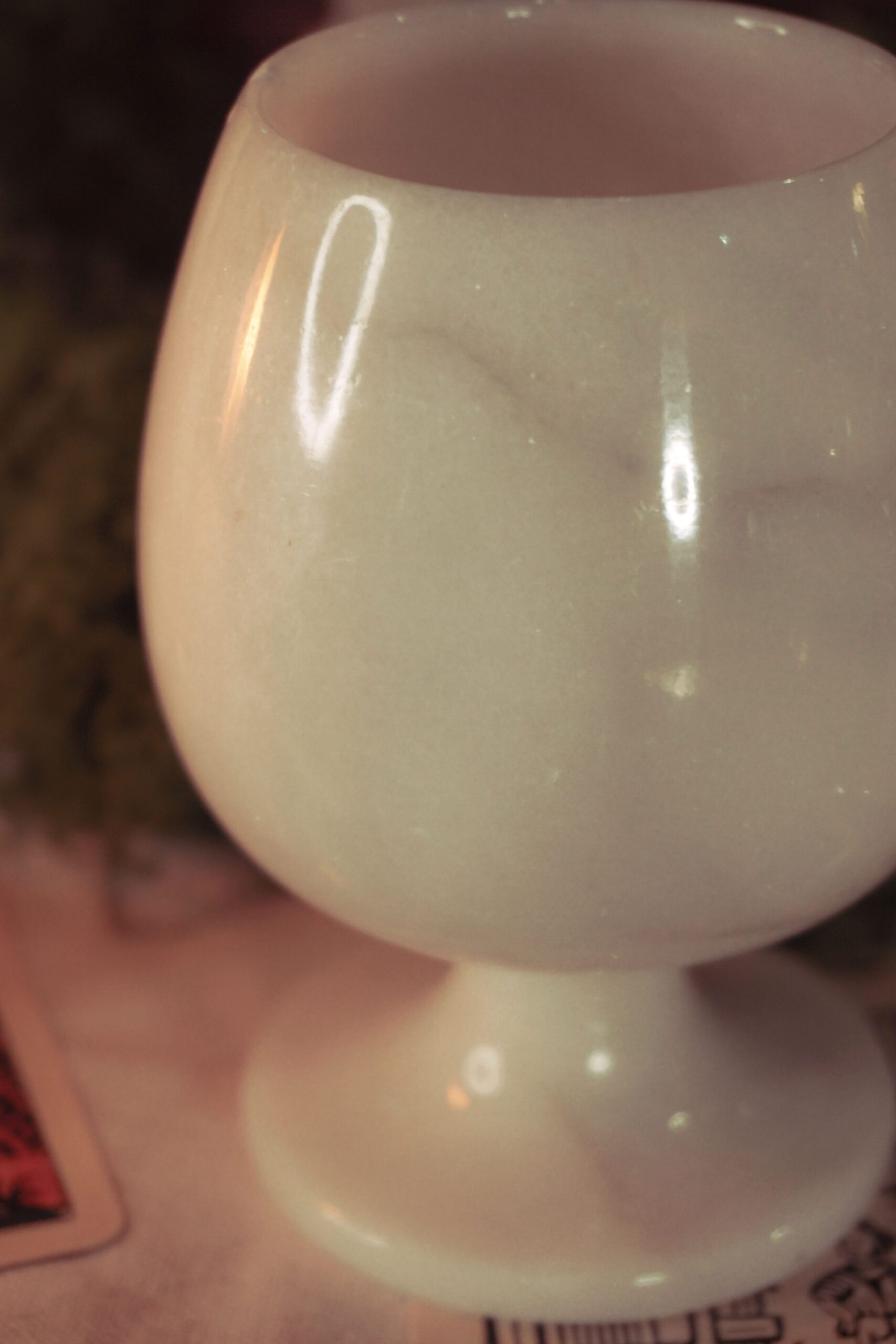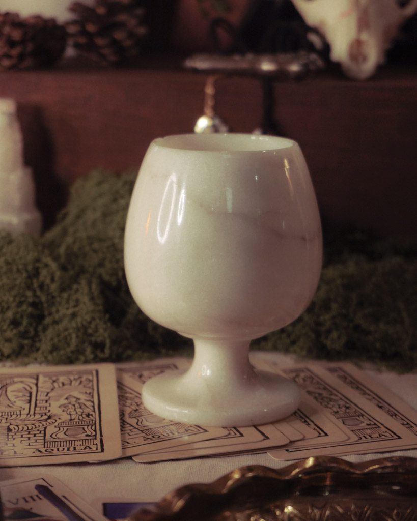 Ce calice sculpté dans une pierre blanche (probablement albâtre) est parfait pour tout travail lié à la lune, la purification, la divination ou la douceur émotionnelle. Sa présence apaise et ancre.