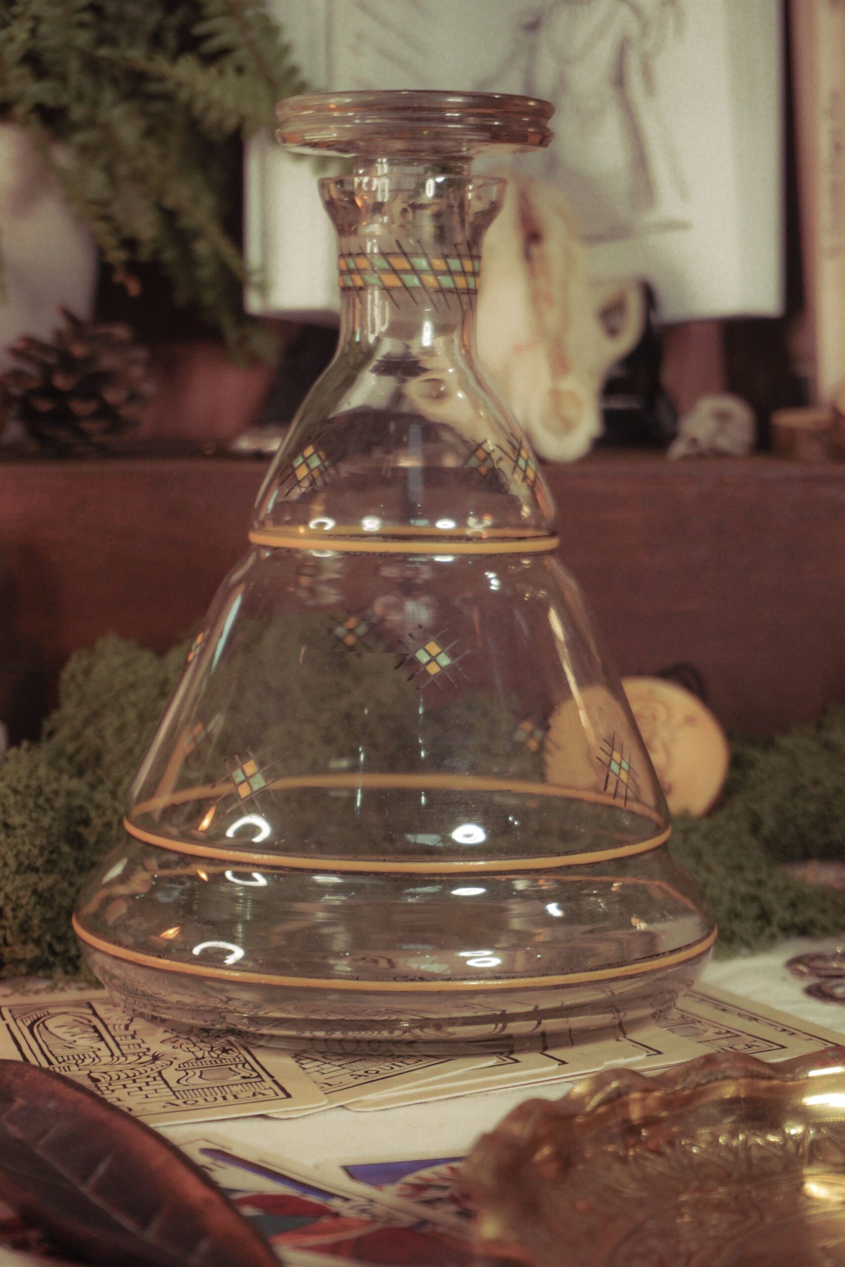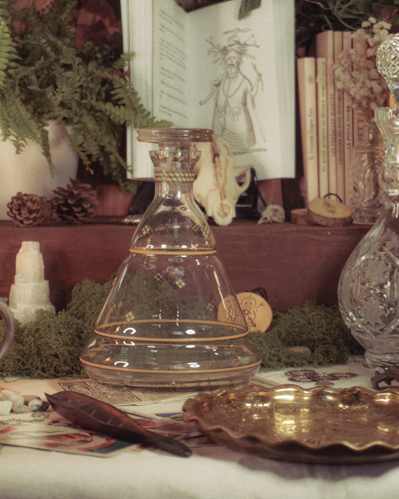 Elle peut être utilisée pour contenir eau solaire, infusions rituelles, alcools sacrés, huiles d’onction ou élixirs personnels. Sa présence sur un autel ouvre un espace d’harmonie et de concentration, notamment dans les rituels liés à la clarté d’esprit, à la transformation ou à l’énergie solaire.