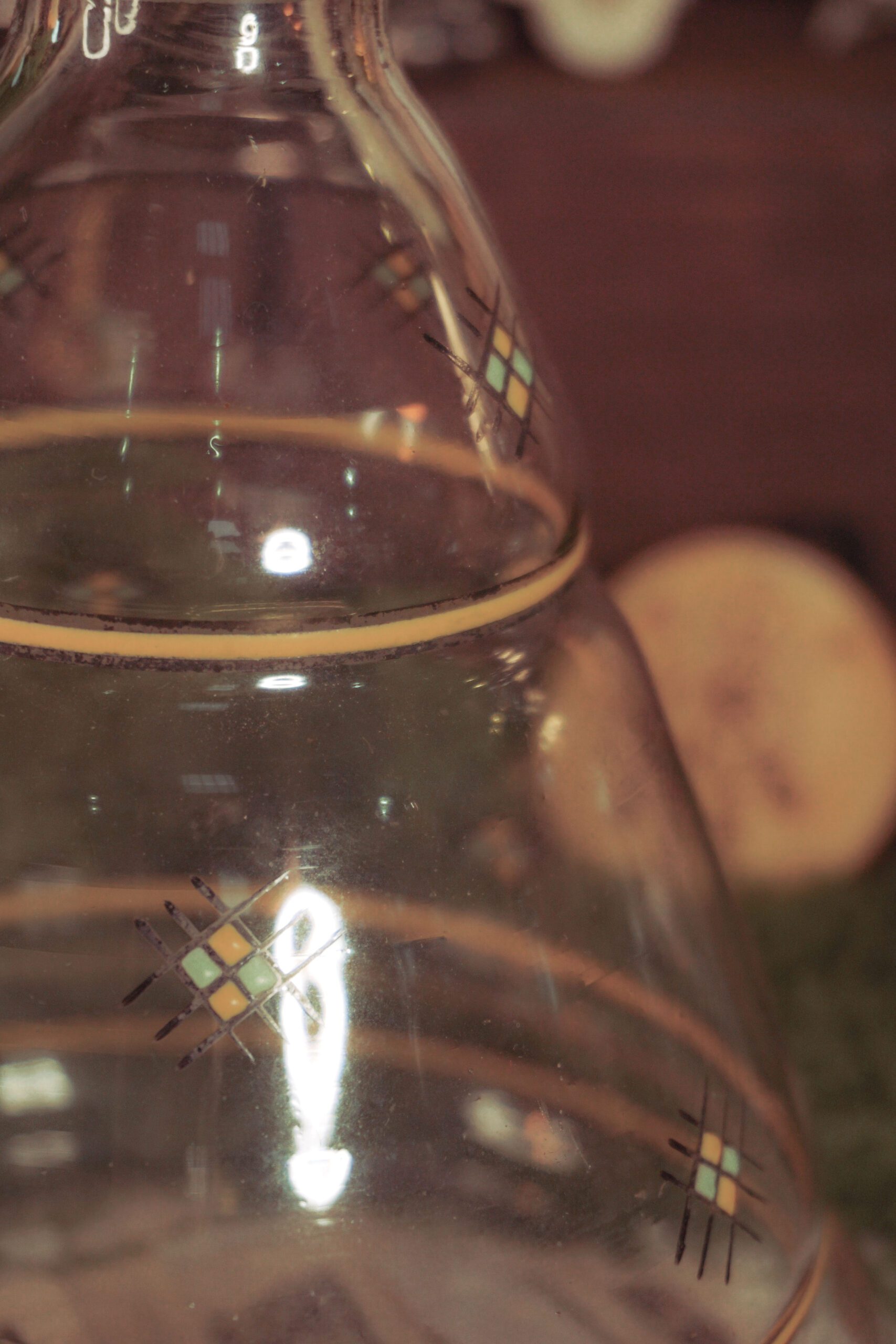Cette carafe au design pyramidal est d’une douceur chaleureuse. Ses lignes évasées, ses bandes jaunes et ses petits motifs colorés lui donnent une allure à la fois mystérieuse et raffinée. Sa forme évoque la stabilité, la montée de l’énergie et l’élévation, autant de symboliques importantes dans les pratiques magiques structurelles.