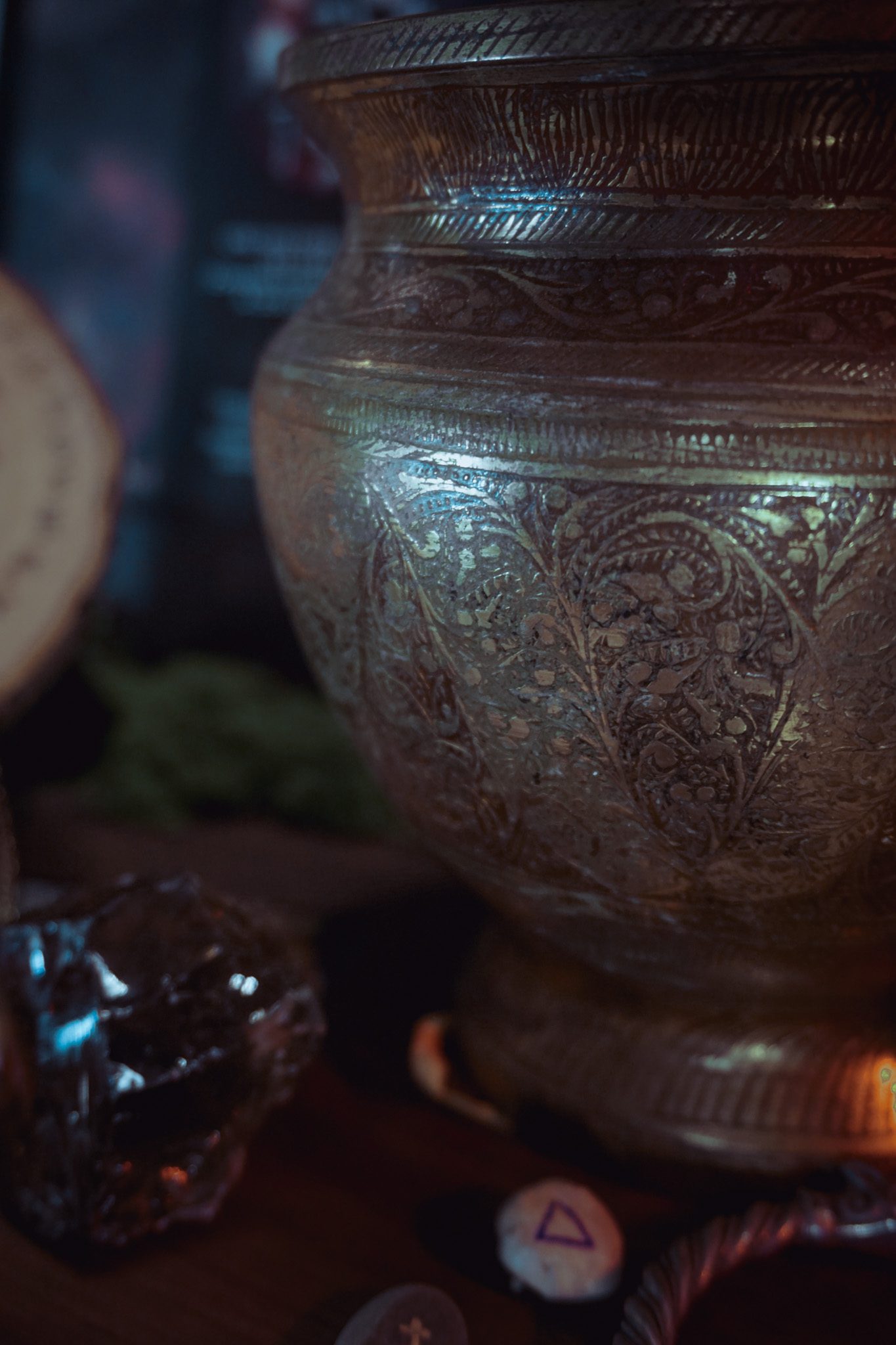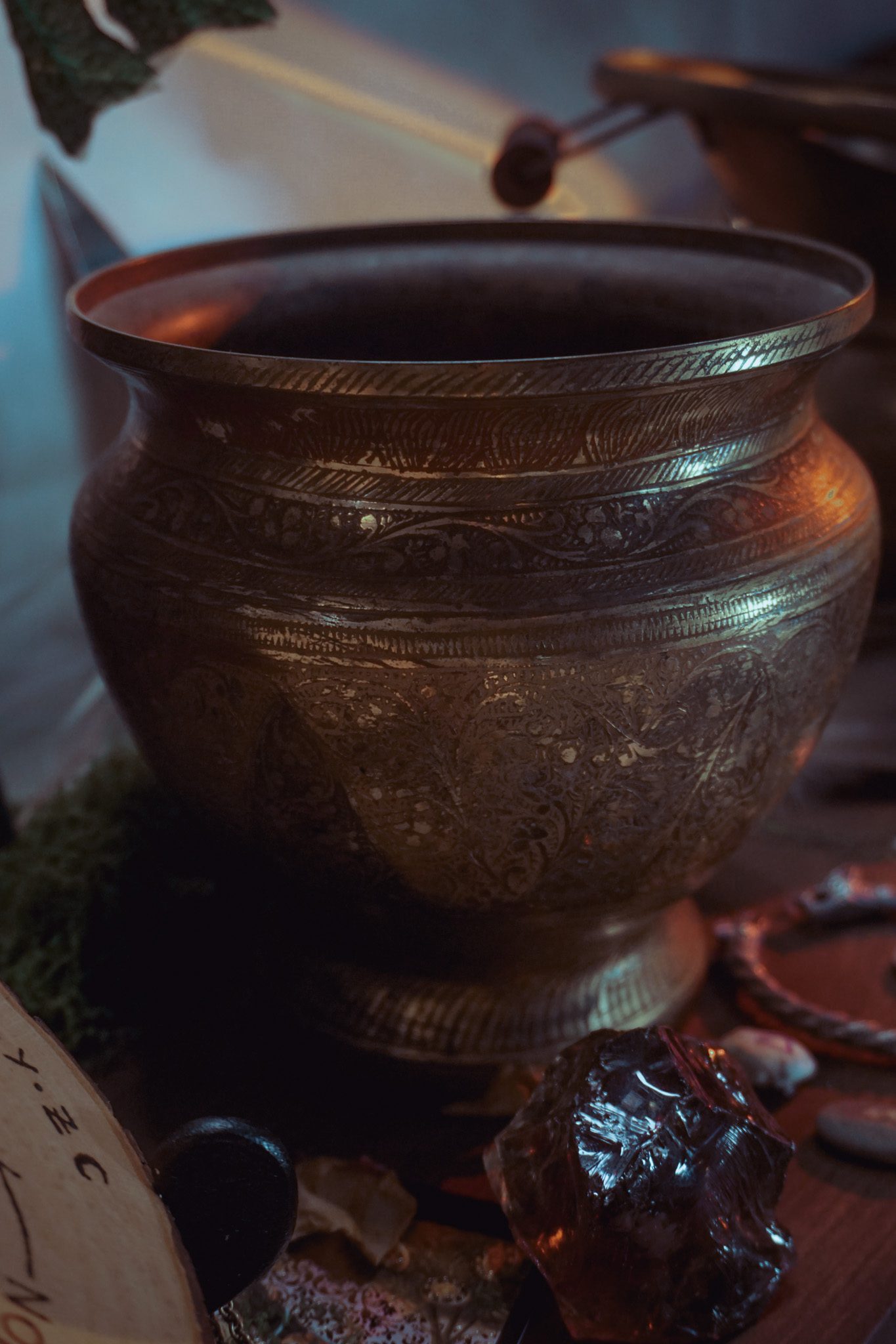 Ce chaudron ou vase en laiton apporte une présence sobre et authentique à votre espace sacré. Stable et robuste, il s’intègre facilement dans une ambiance mystique ou d’inspiration artisanale.
