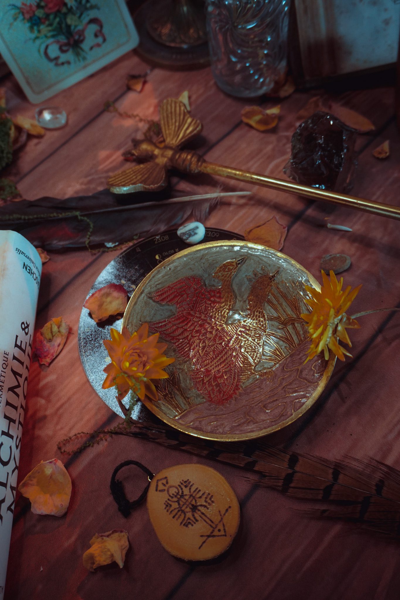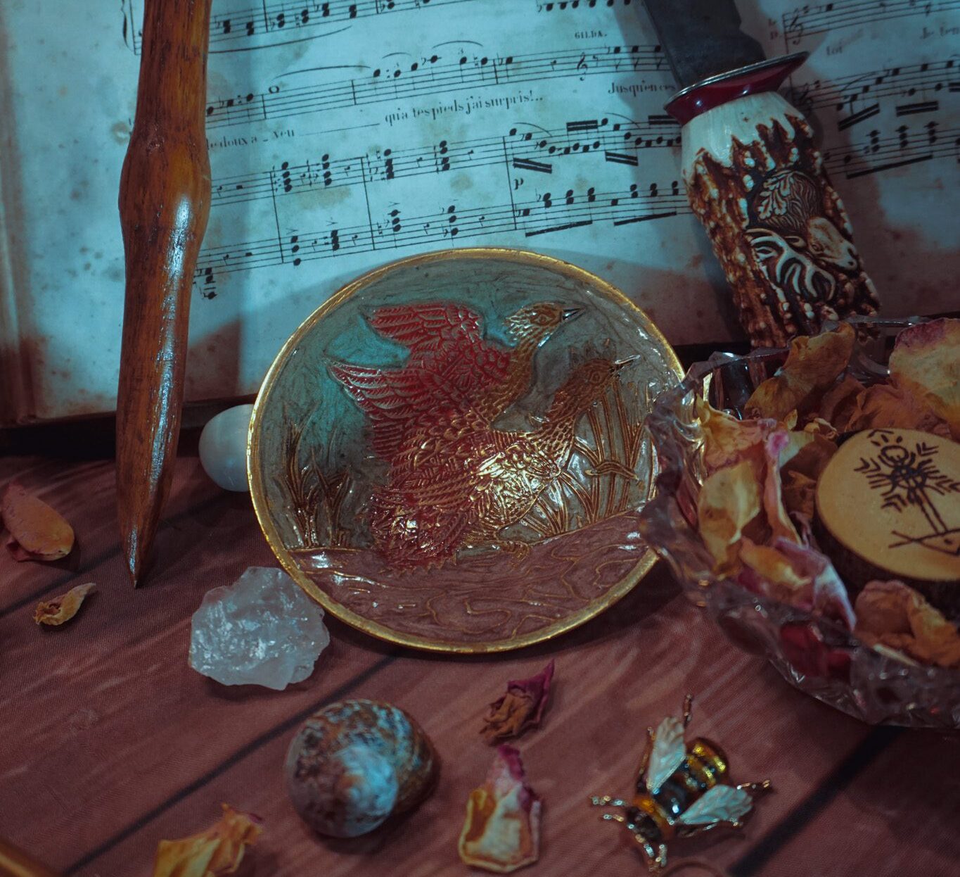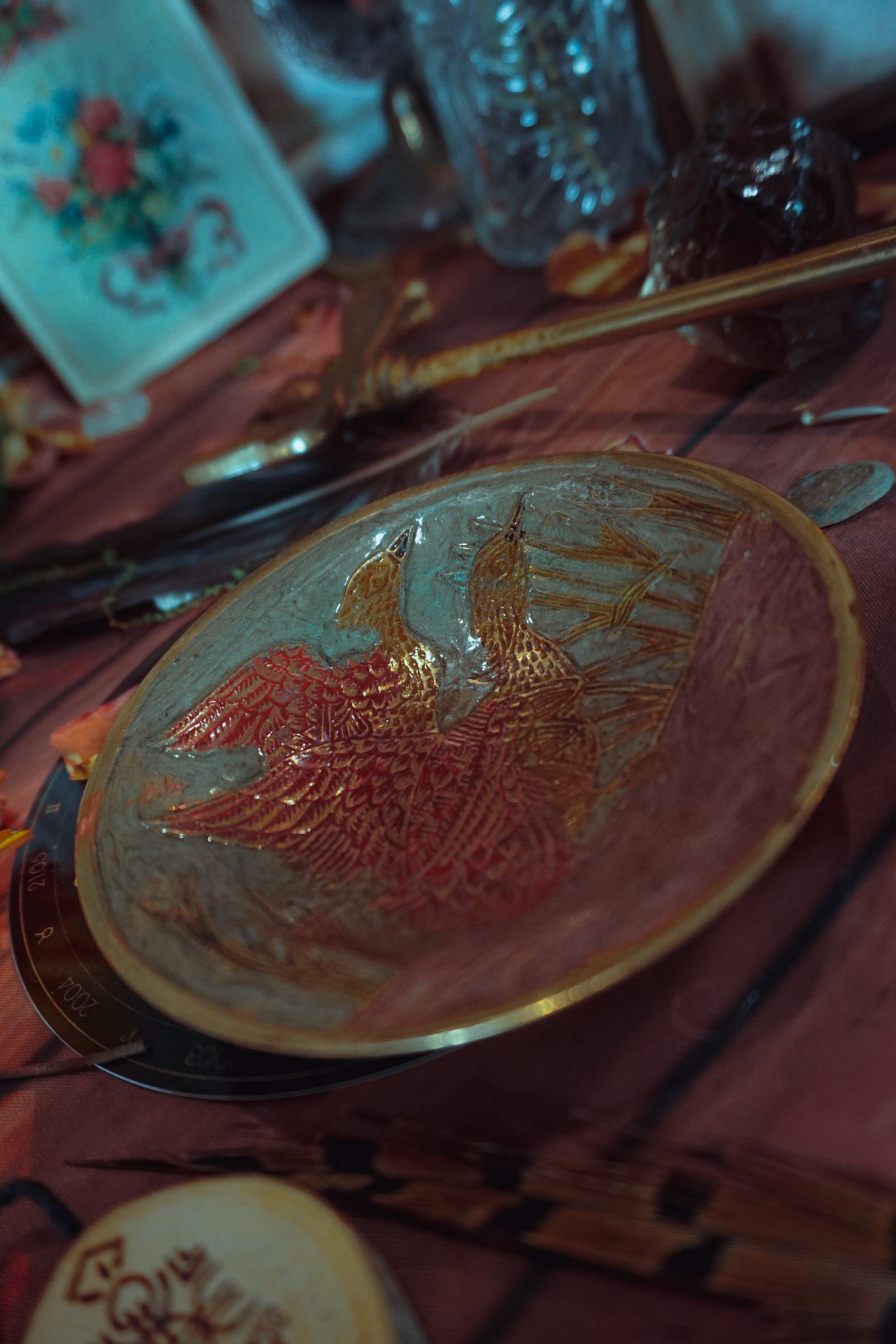 Cette coupelle en métal finement gravée représente deux canards côte à côte, symbole de mouvement. Sa taille compacte en fait un support idéal pour accueillir offrandes, herbes, résines ou petits talismans.