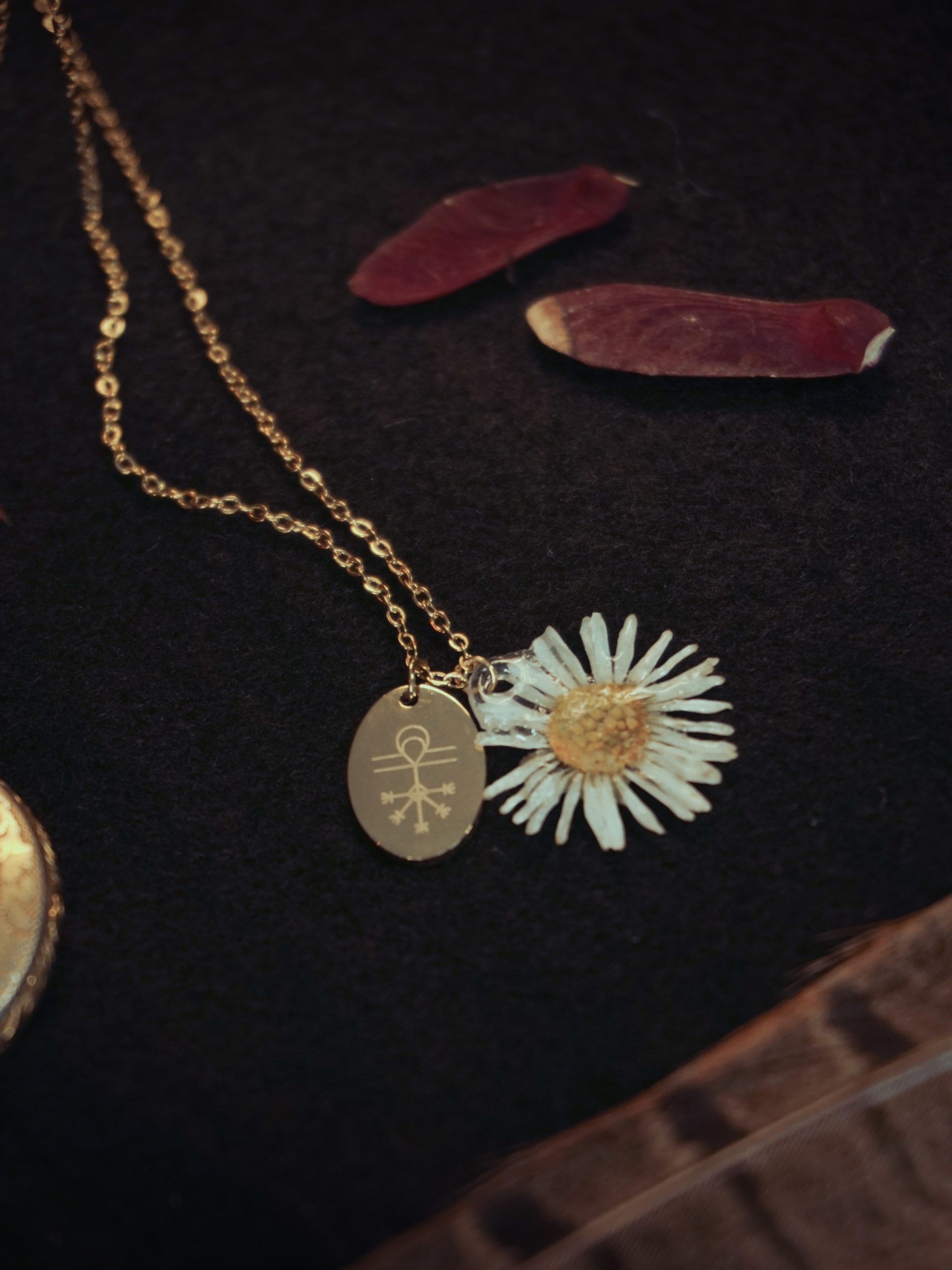 La pâquerette bien que d’apparence douce, porte le nom scientifique de Bellis perennis. Faisant référence à la fois au mot latin bellus pour la beauté et bellum pour la guerre. Car celle-ci fleurissait sur les champs de bataille. Perennis signifie pérenne, c’est-à-dire, « À perpétuité ». Le choix de la pâquerette pour compléter ce talisman n’est pas anodin. En effet, il allie la chance et le succès, à la détermination et la discipline, pour un chemin solide et empli de réussites.