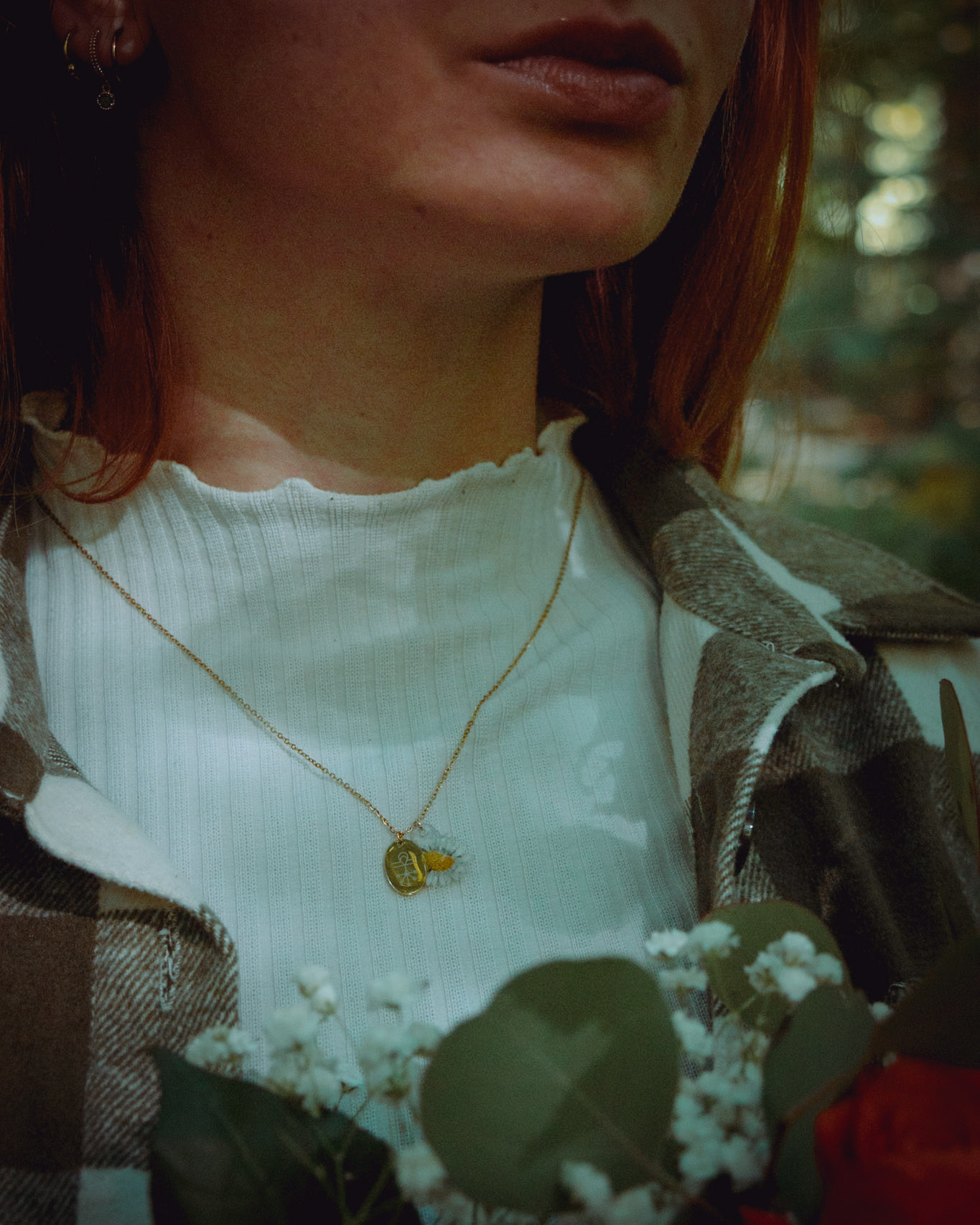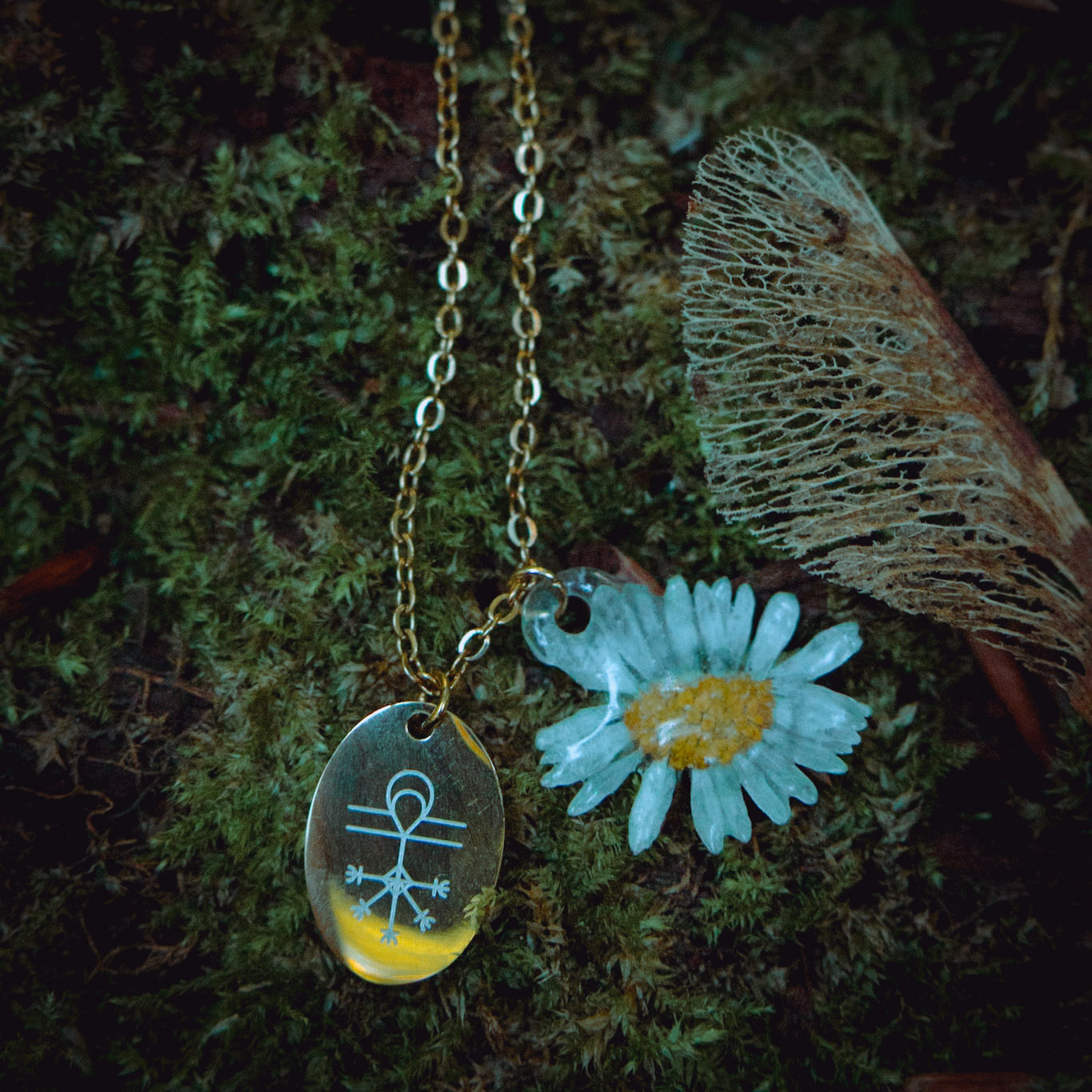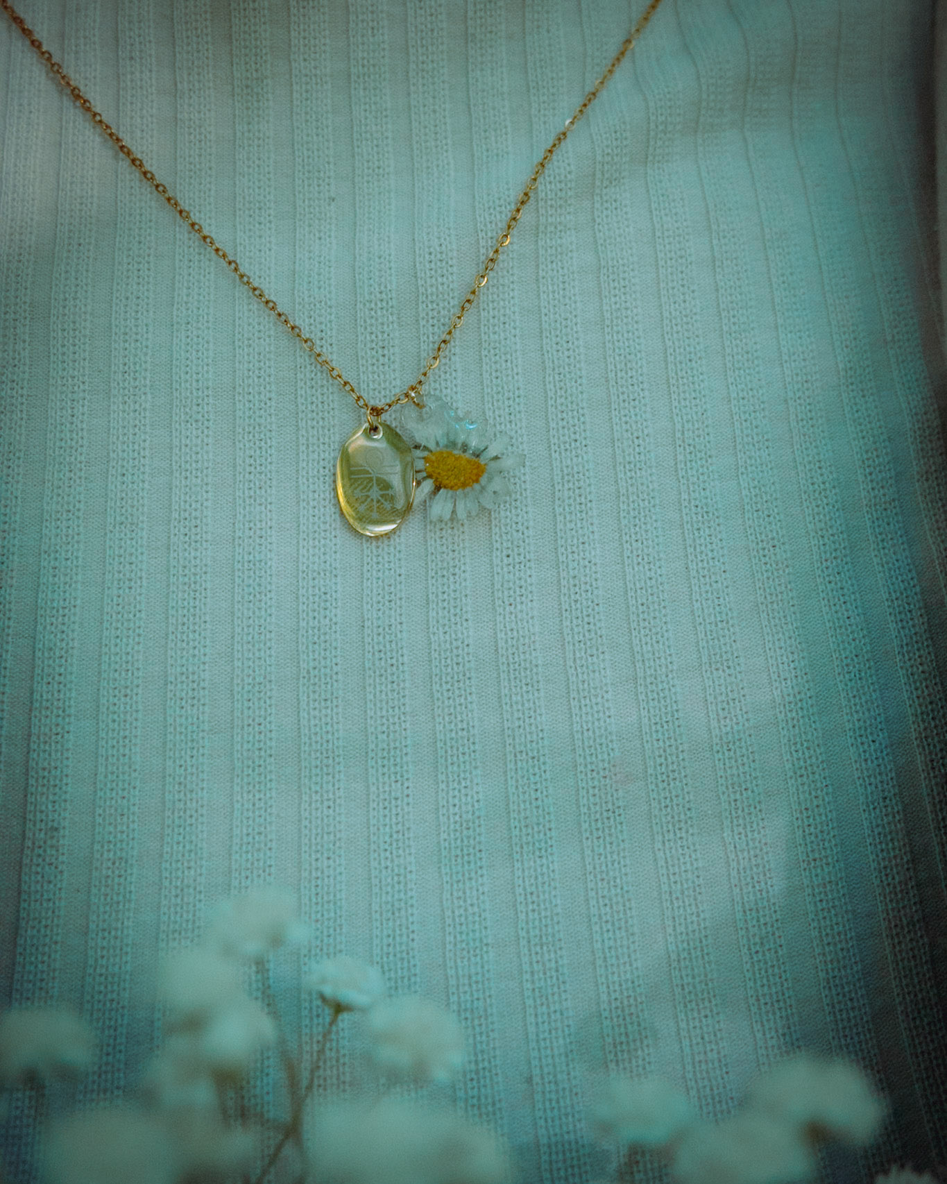 Ce joli pendentif a été confectionné avec le logo de la boutique pour vous apporter chance, succès et rayonnement. Le médaillon est gravé au laser et la pâquerette a été mise en résine dans notre atelier. Le tout est ensuite assemblé.