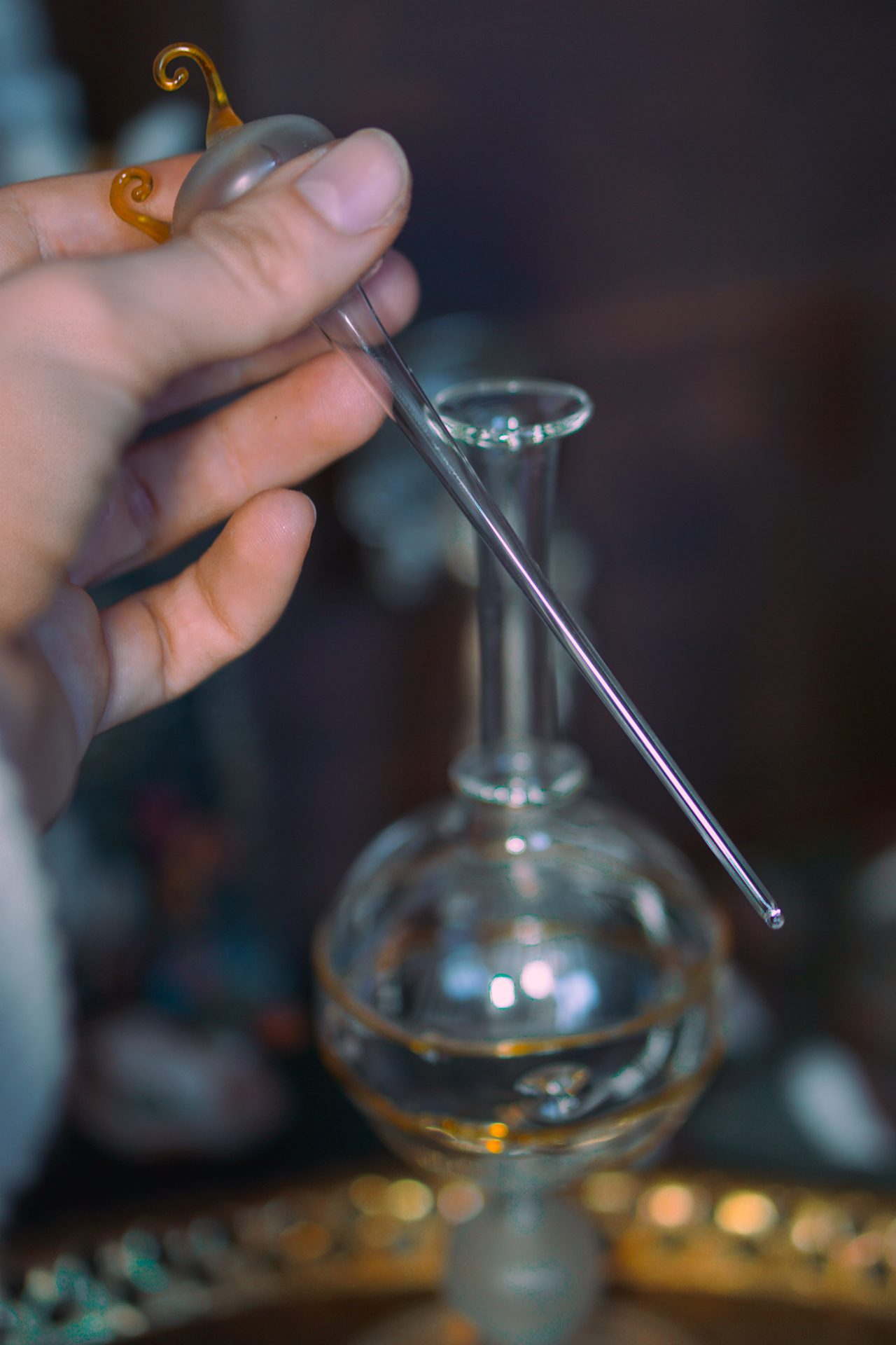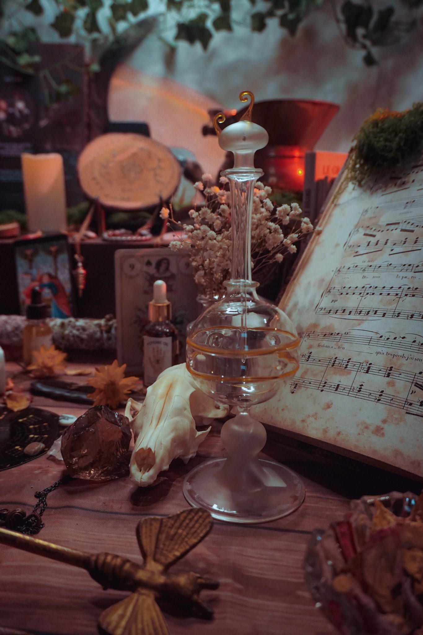 Elle est idéale pour conserver huiles, élixirs, eaux consacrées ou préparations symboliques, tout en mettant en valeur leur couleur et leur clarté. Une pièce lumineuse et raffinée pour enrichir votre espace de pratique ou votre cabinet personnel.