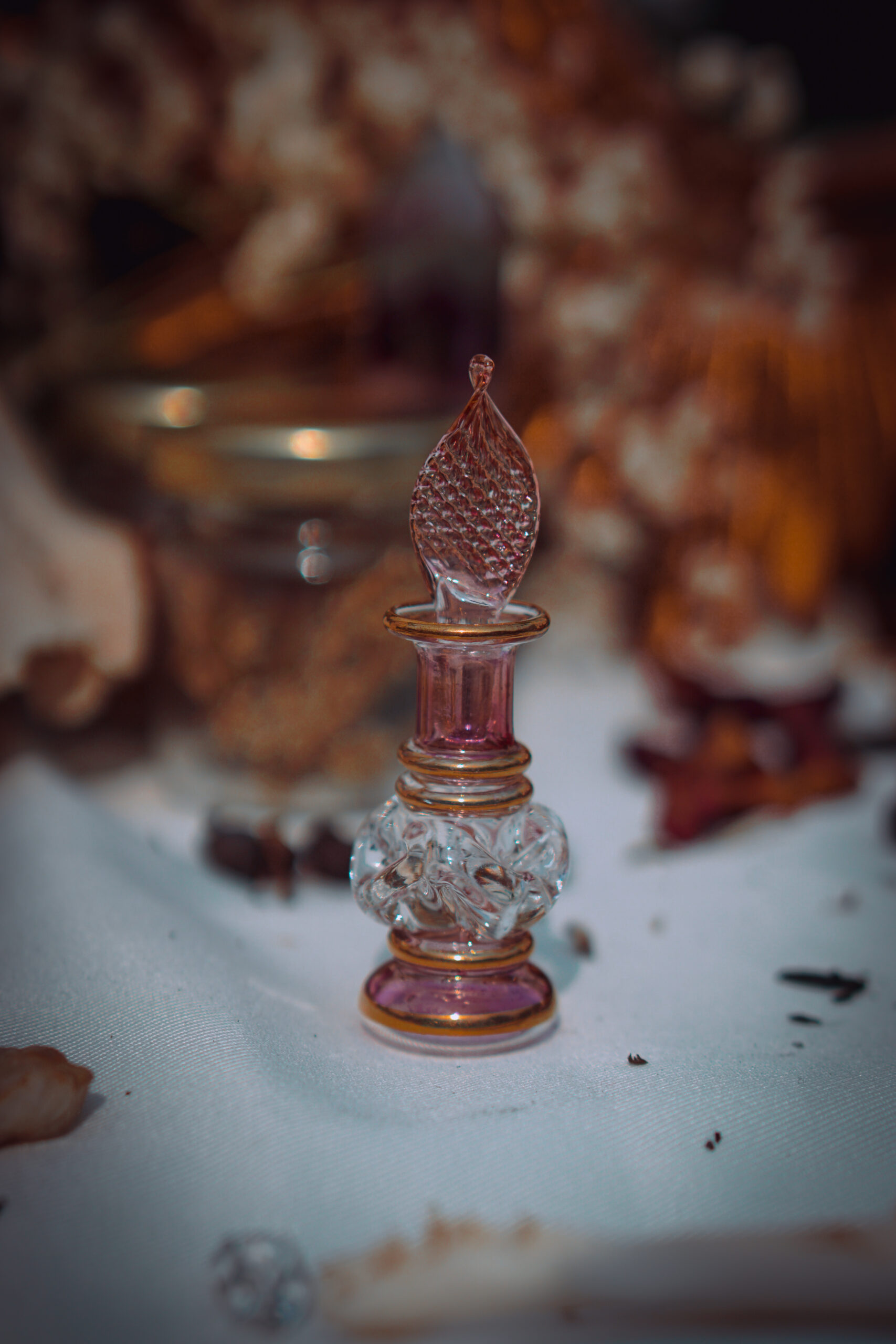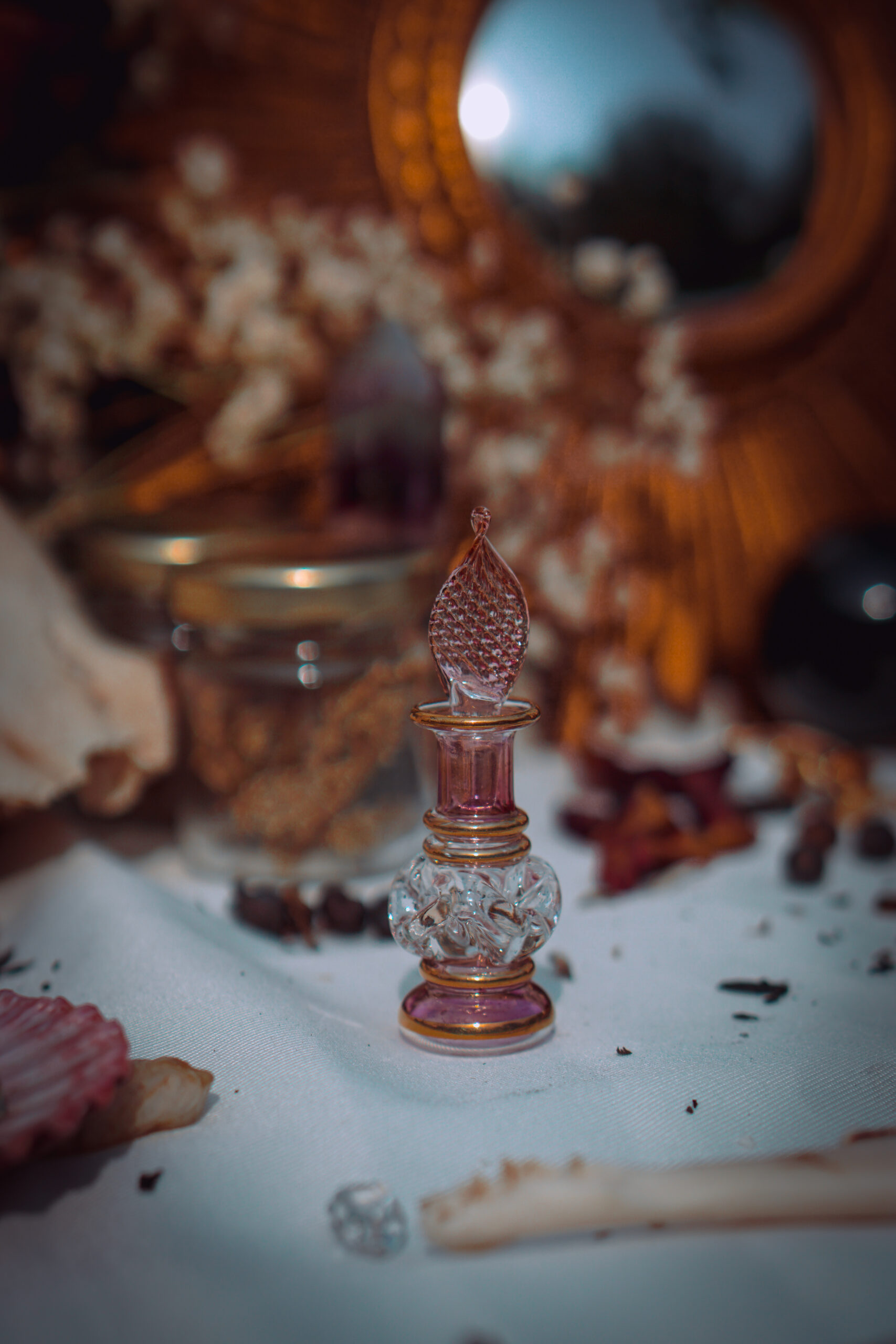 Rond comme la lune pleine, orné de fleurs qui semblent danser sous le verre, ce flacon est le plus féminin de la collection. Ses reflets rosés et irisés changent avec la lumière comme une humeur qui respire. Pour les huiles de dévotion, les parfums sacrés ou les élixirs de lune rose, il est le réceptacle idéal de tout ce qui est doux et puissant à la fois.