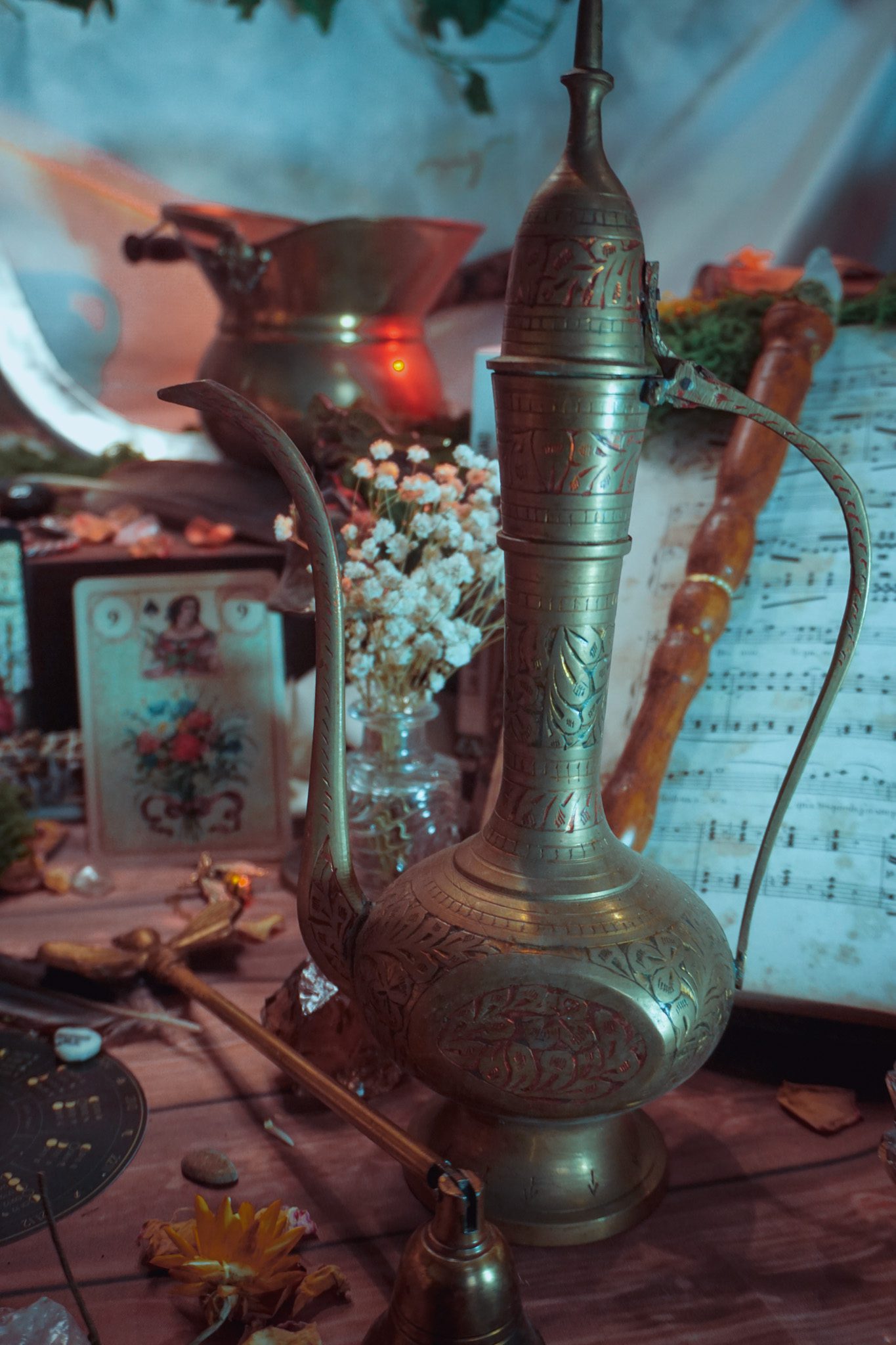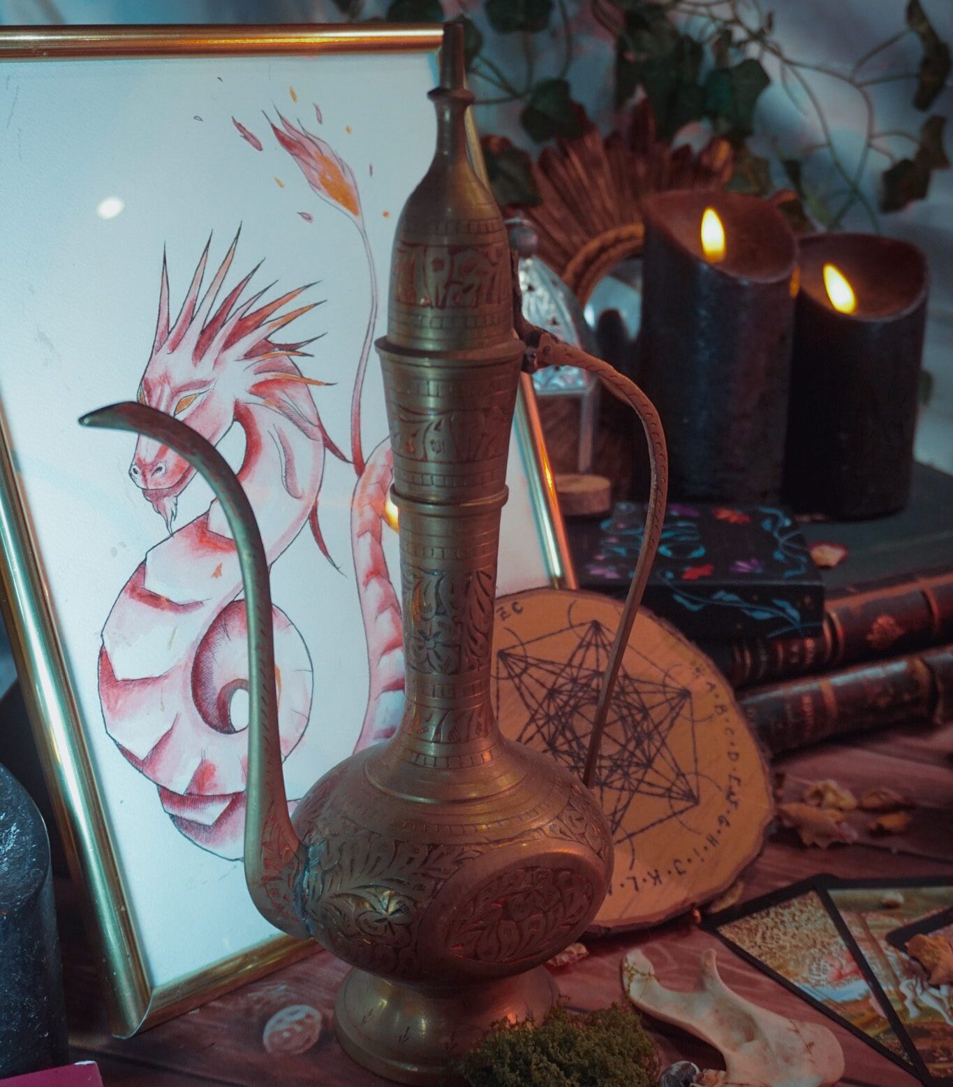 Idéale comme élément décoratif fort, elle peut également servir à verser eau rituelle, infusions ou préparations symboliques avec précision. Une pièce de caractère pour enrichir un autel, un cabinet ou une ambiance inspirée des traditions anciennes.